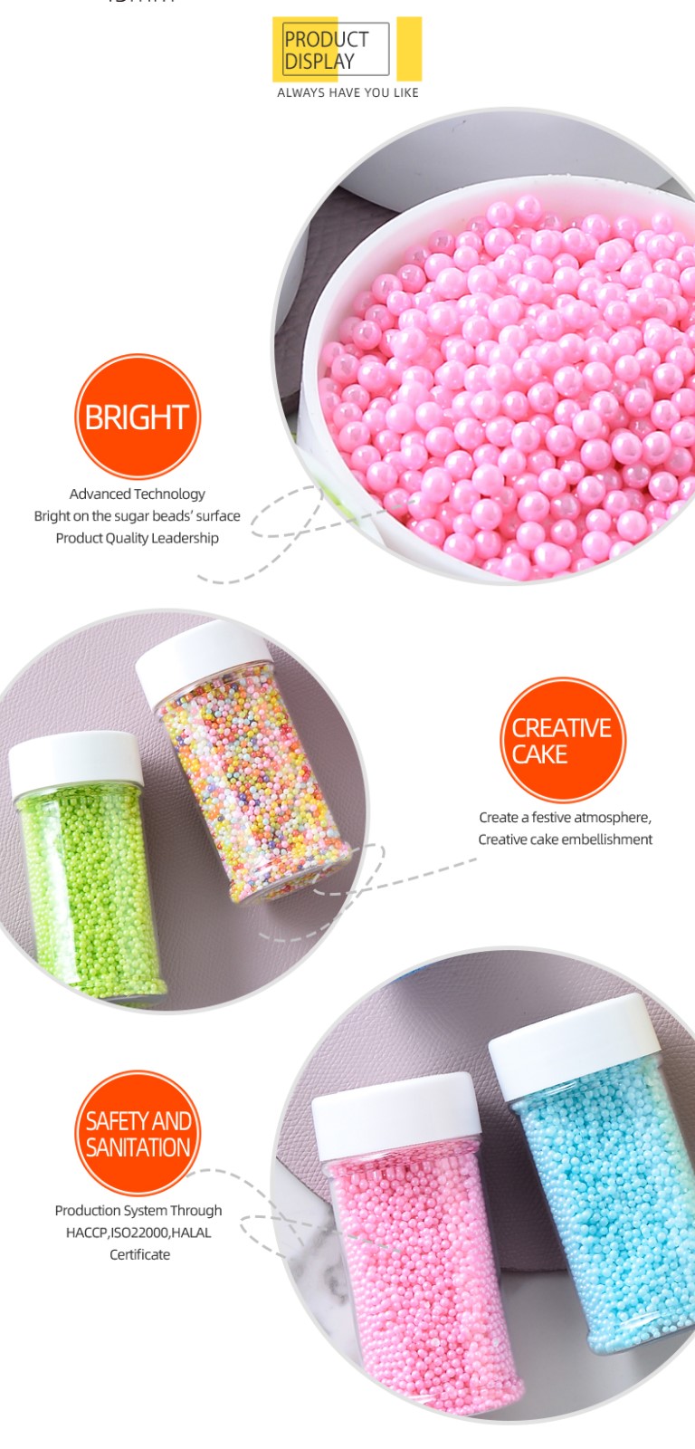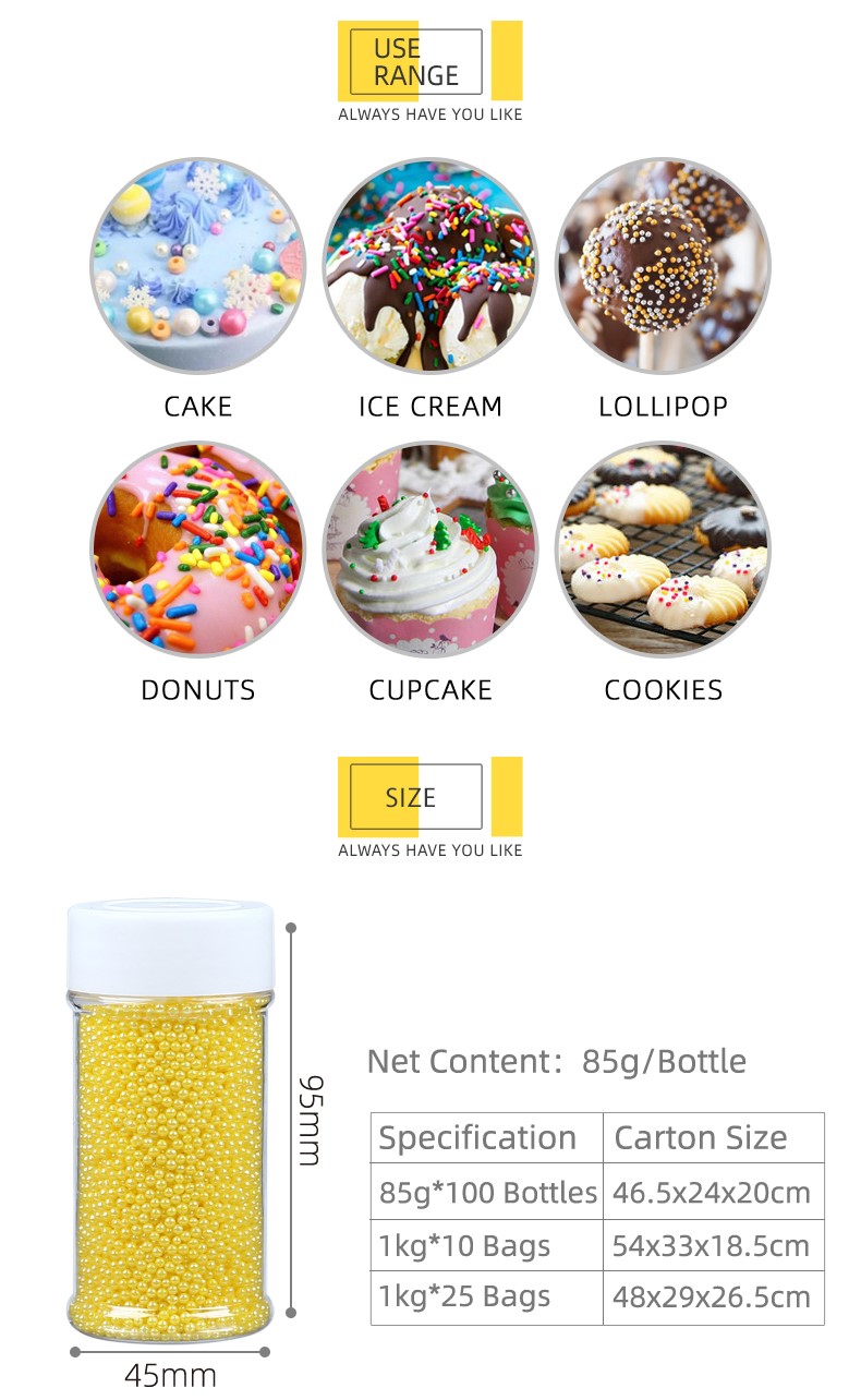 Largement utilisé dans les gâteaux, les glaces, les sucettes, les biscuits, le chocolat, etc. Pas de gluten, pas de produits laitiers, pas de soja. Technologie de pointe, leadership en matière de qualité des produits, création d'une atmosphère festive, décoration de gâteaux créative. Système de production par certificat HACCP, ISO22000, HALAL, BRC.